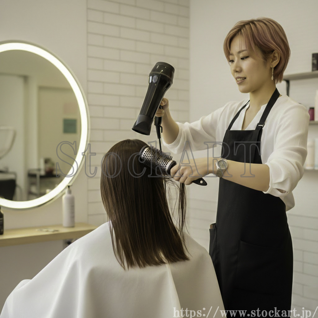 スタンダードAI生成JPGサンプル顧客の髪をブローする美容師