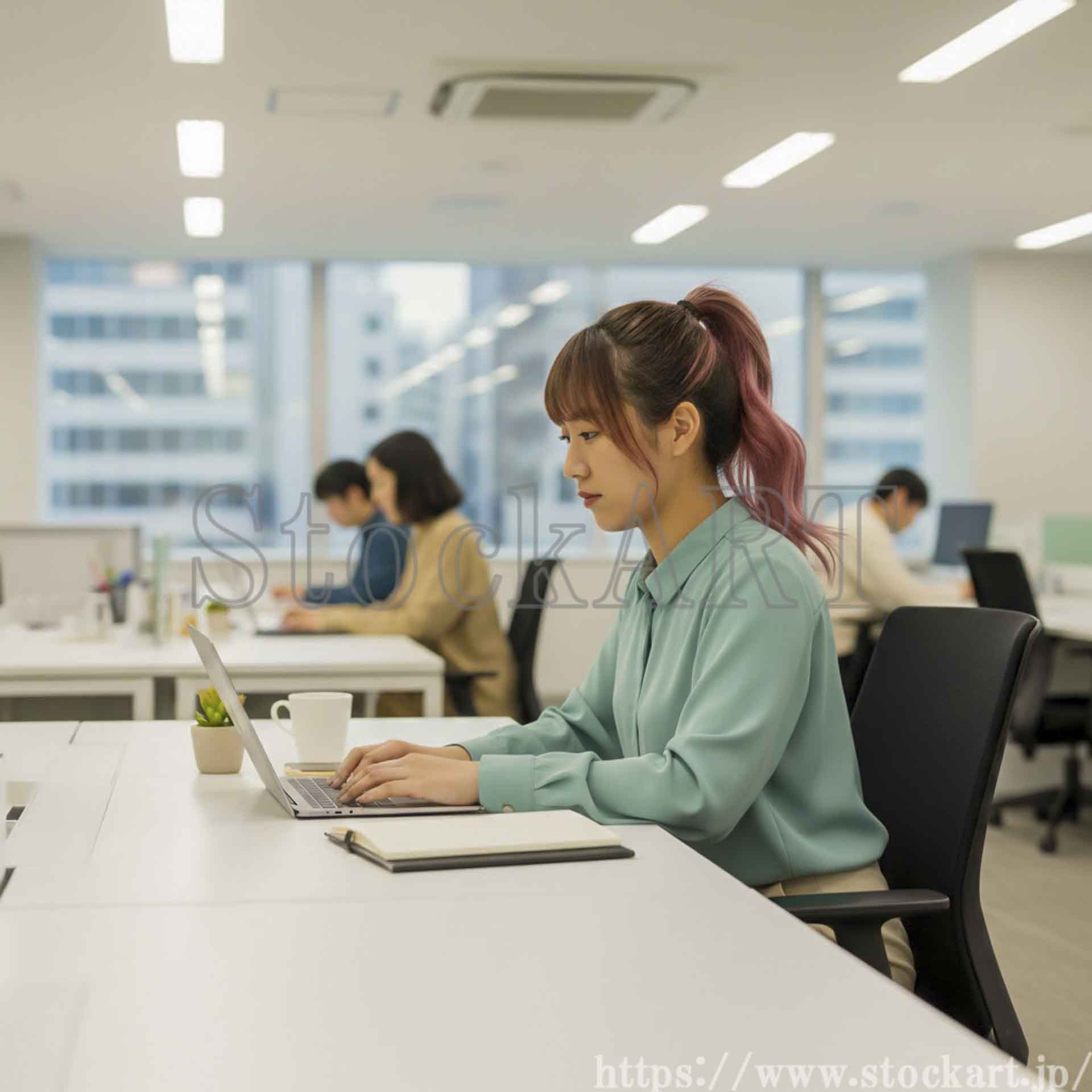 スタンダードAI生成JPGサンプルオフィスのデスクでノートパソコンを操作し仕事をする女性