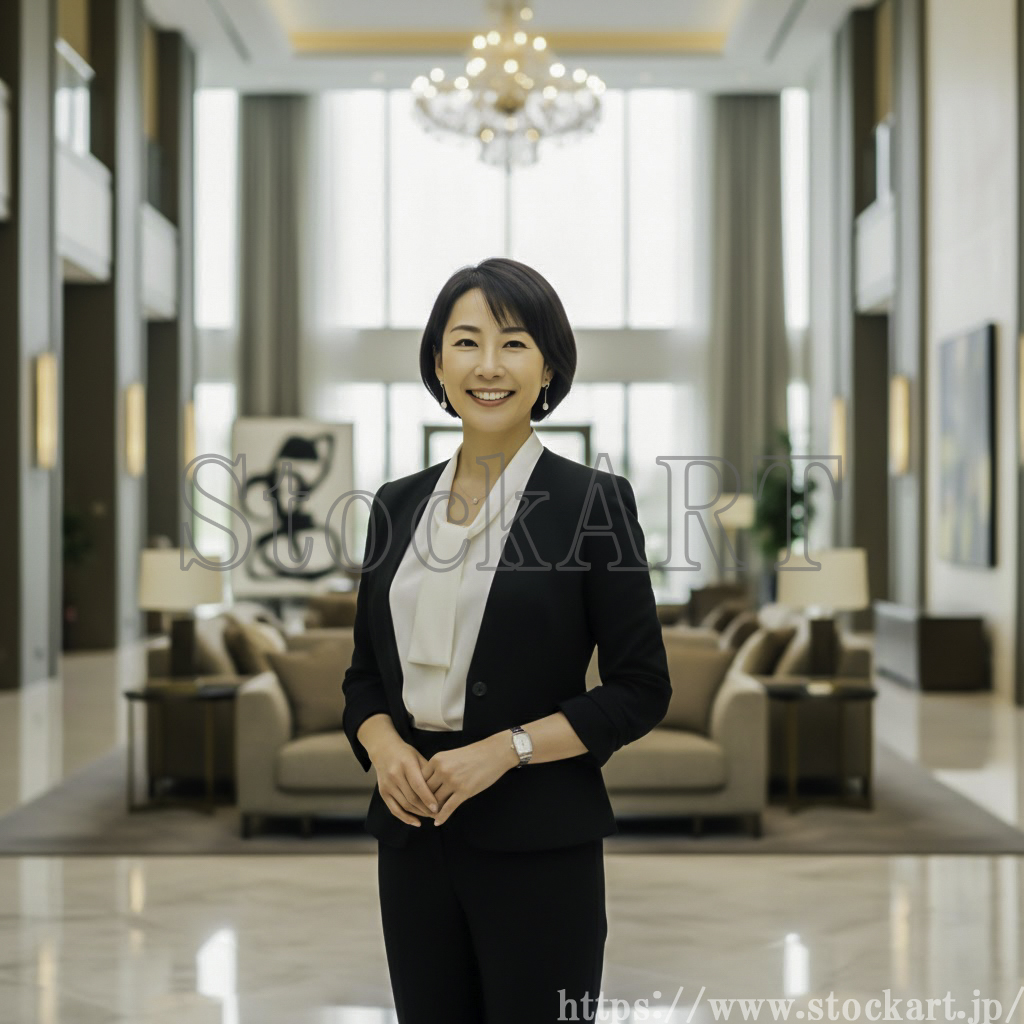 スタンダードAI生成JPGサンプルホテルのロビーに立つ女性スタッフ