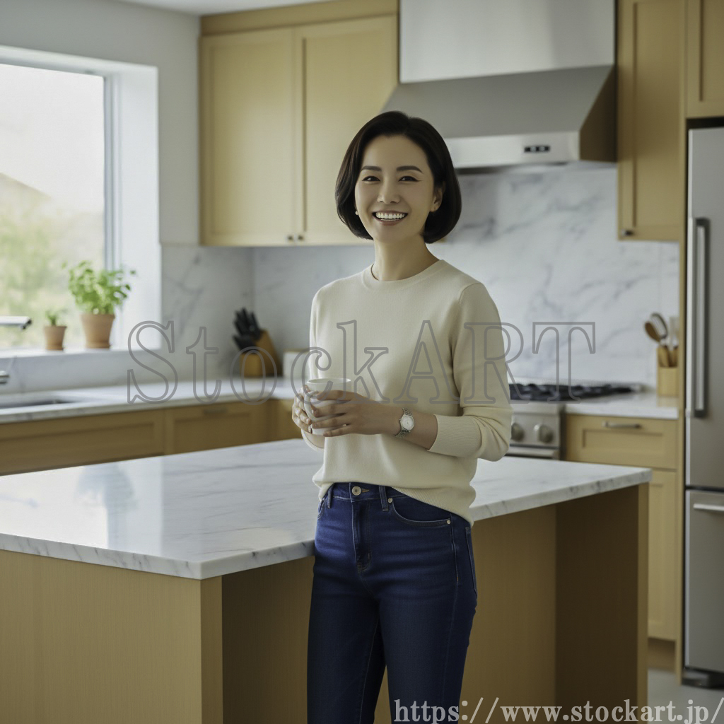 スタンダードAI生成JPGサンプル明るいキッチンでコーヒーを片手に微笑む大人の日本人女性のAI生成写真