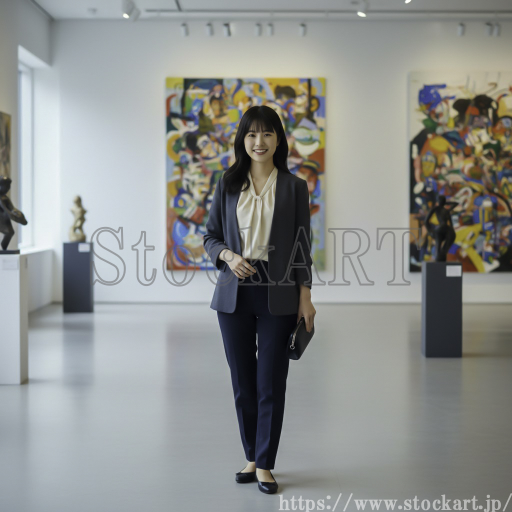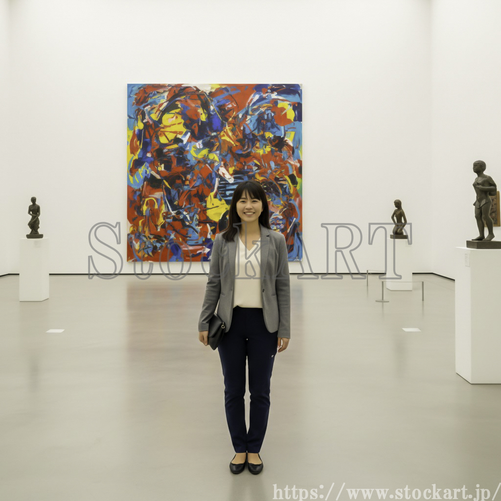 スタンダードAI生成サンプル美術館でアートを鑑賞する笑顔の日本人女性