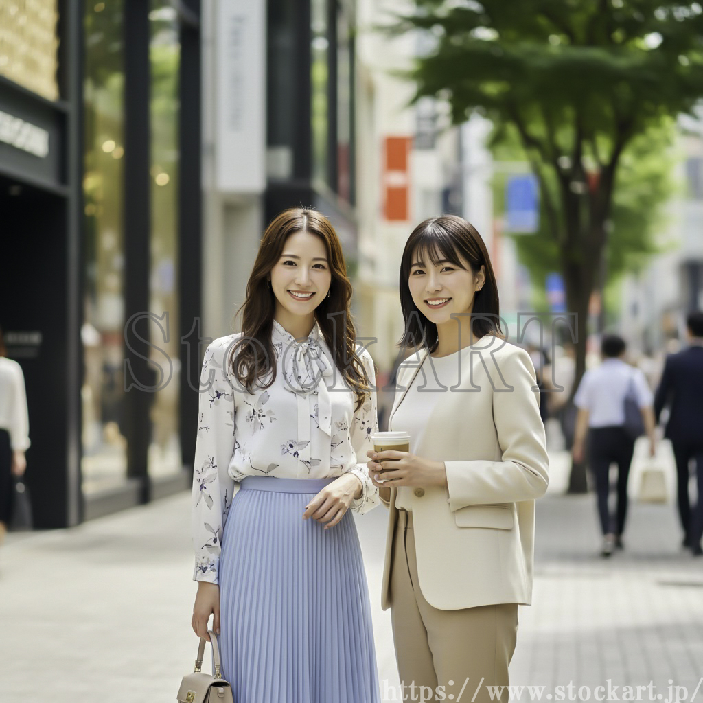 スタンダードAI生成JPGサンプルコーヒーを片手に街角で並ぶ二人の女性