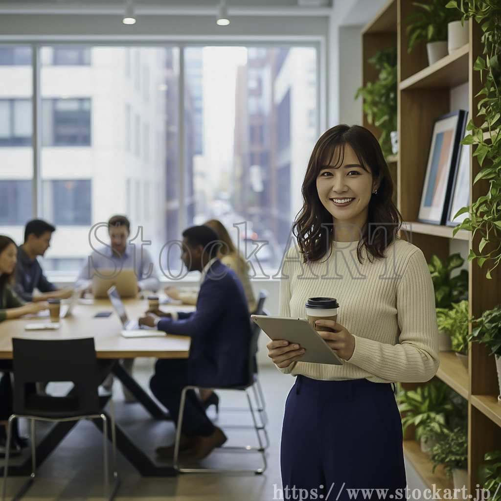 スタンダードAI生成JPGサンプルオフィスでタブレットを持つ女性