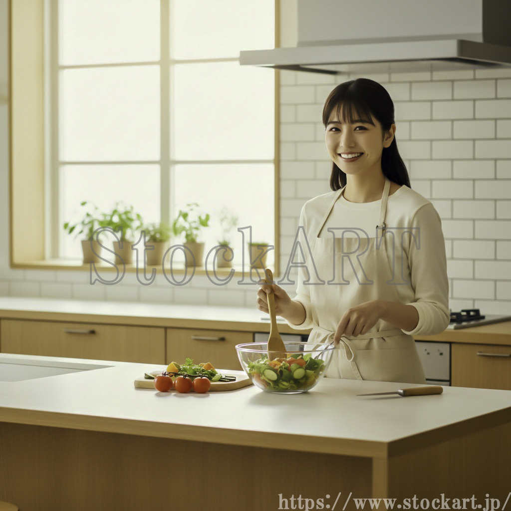 スタンダードAI生成JPGサンプル明るいキッチンでサラダを作る女性