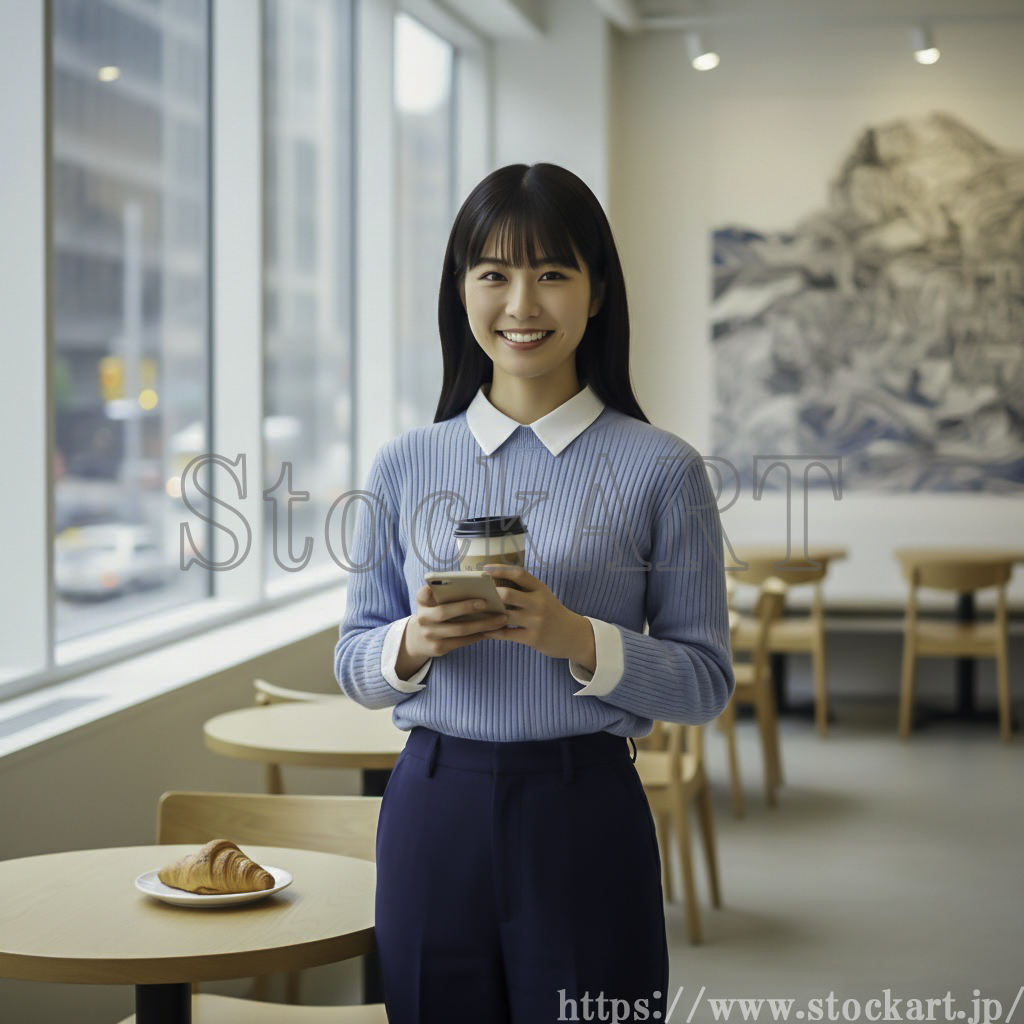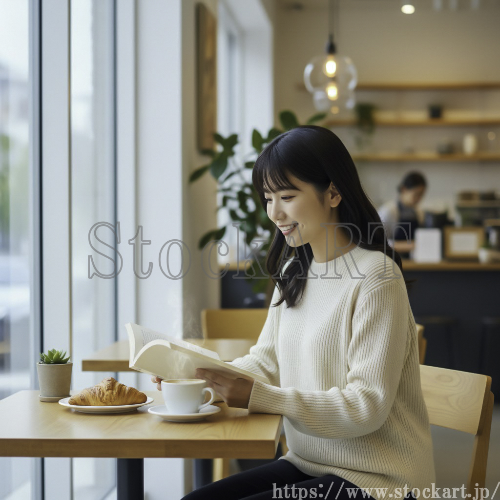 スタンダードAI生成JPGサンプルお洒落なカフェで読書とコーヒーを楽しむ女性