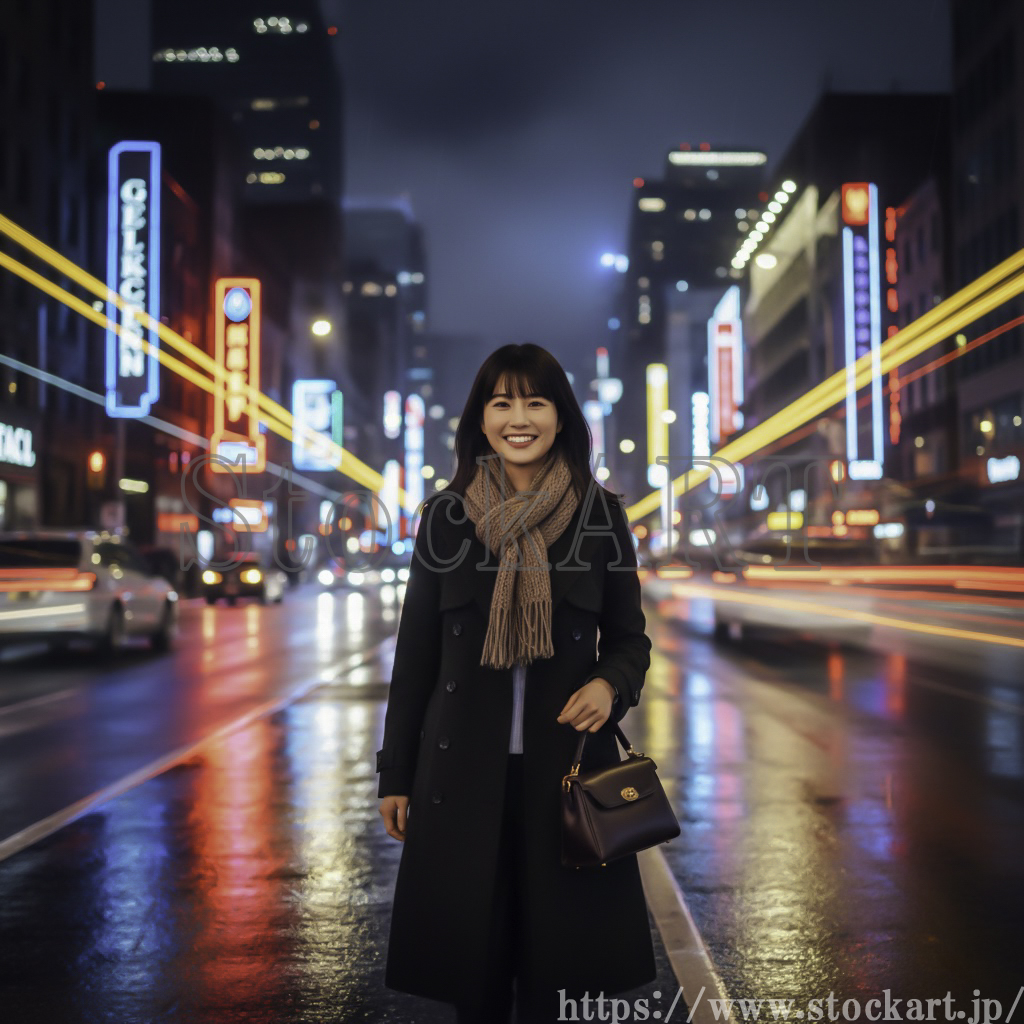 スタンダードAI生成JPGサンプル華やかな都会の夜景とコート姿の笑顔の女性