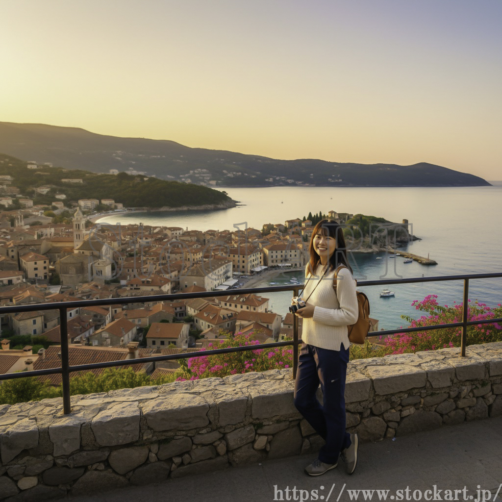 スタンダードAI生成JPGサンプル高台から古い街並みを見下ろすで旅行中の女性