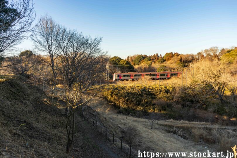 さくらの山の斜面を走る京成電鉄の車両